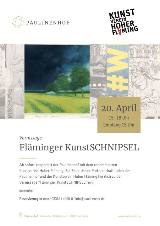 Zur Feier dieser Partnerschaft laden der Paulinenhof und der Kunstverein Hoher Fläming herzlich zu der Vernissage “Fläminger KunstSCHNIPSEL” ein. Diese findet am Samstag, den 20. April, von 15:00 bis 18:00 Uhr statt. Unter anderem werden folgende Künstler*innen werden Ihre Werke im Paulinenhof ausstellen: Bernadette Arnaud, Brigitte Heßler, Daniel Kajari, Ilan Hunke, Jürgen Parusel, Marita Wiemer, Nikolai Kraneis, Sarah Schultz und Werner Reister (1943 – 2022).